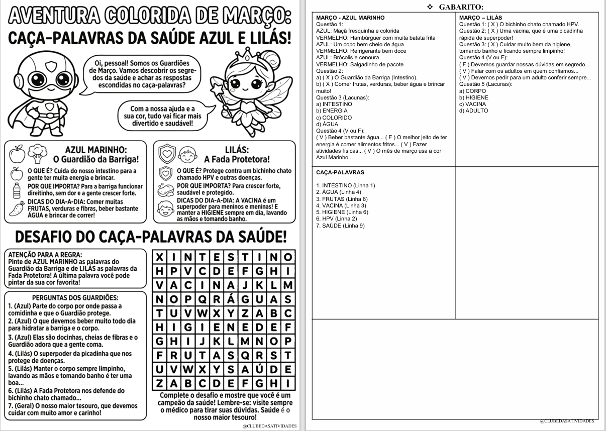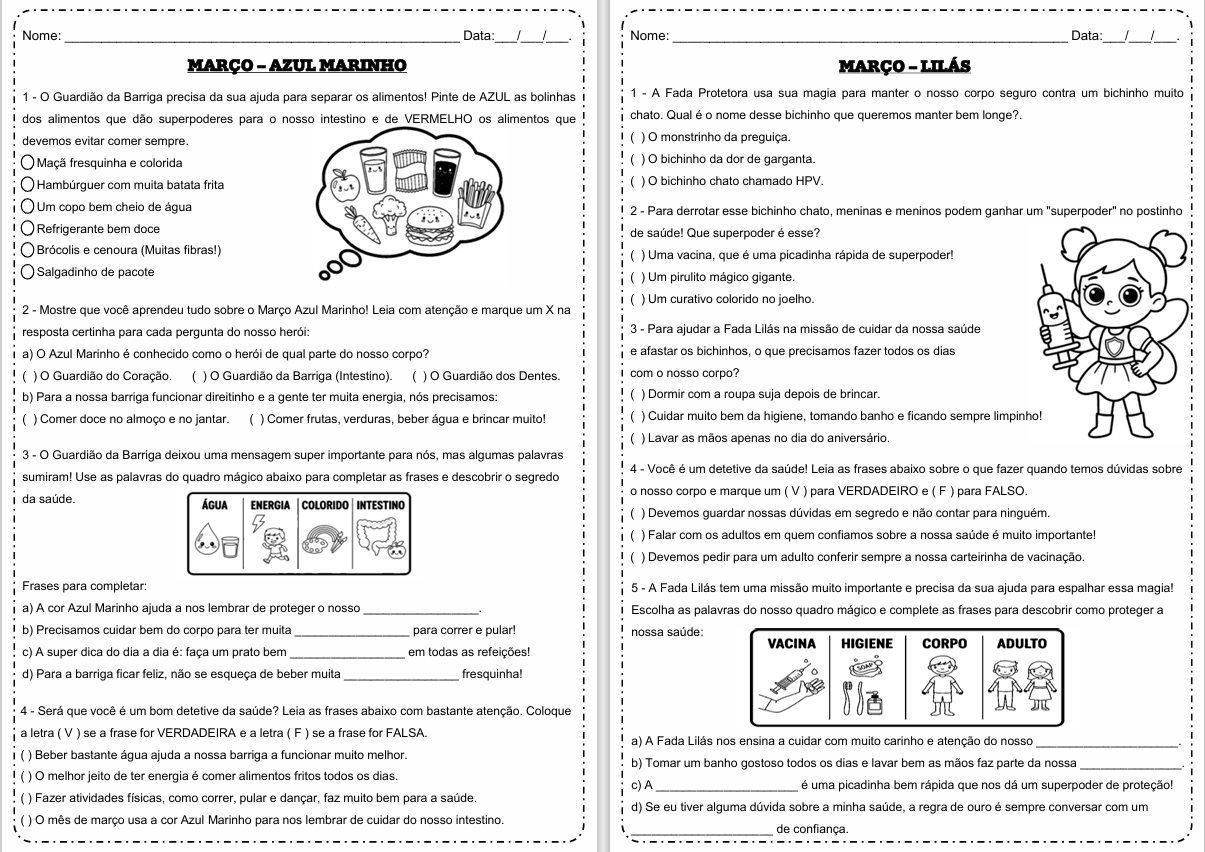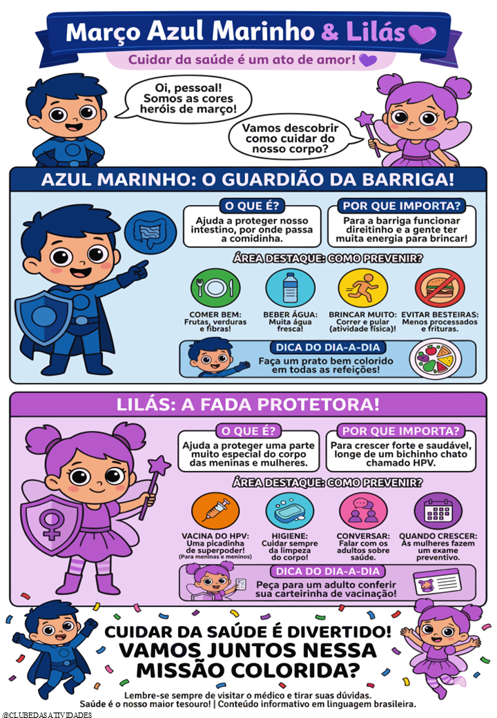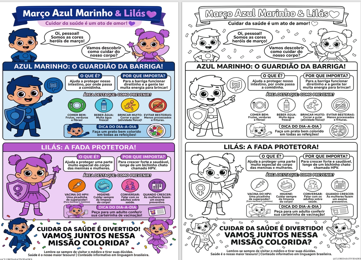 ✅ Capa A4 colorido explicando os 2 temas (Azul Marinho: cuidado com o intestino / Lilás: HPV, higiene e vacina)