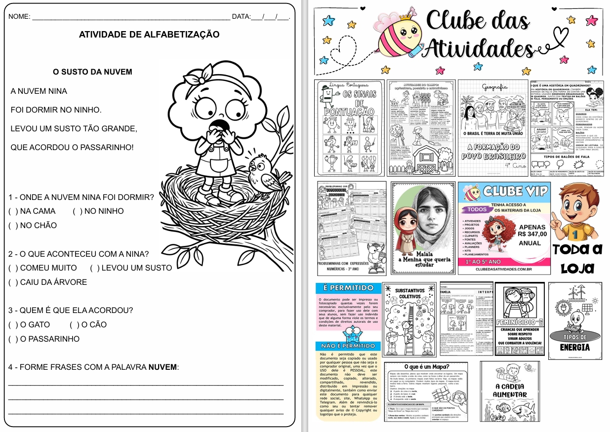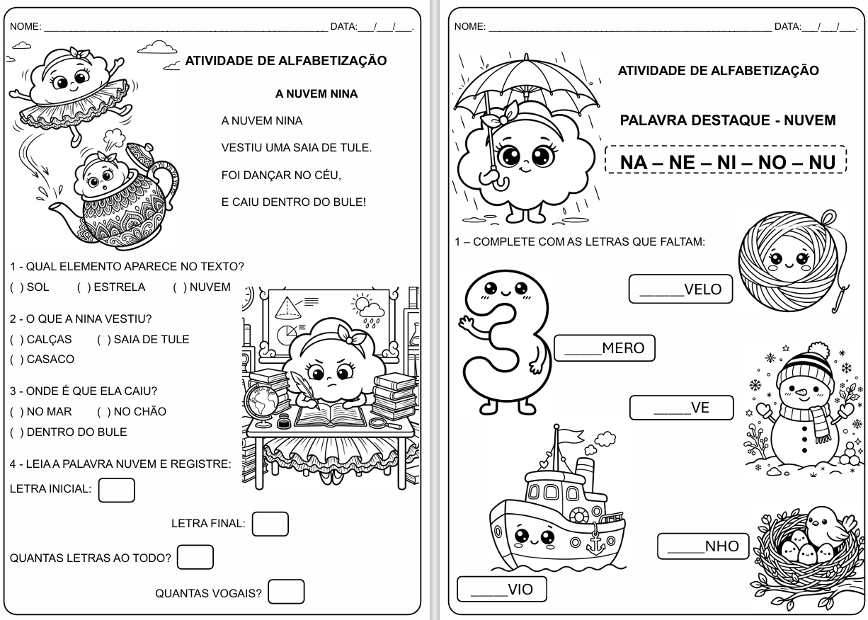 📖 Textinhos rimados para leitura: As historinhas “A Nuvem Nina” e “O Susto da Nuvem”, com frases curtas e vocabulário ideal para quem está começando a ler.