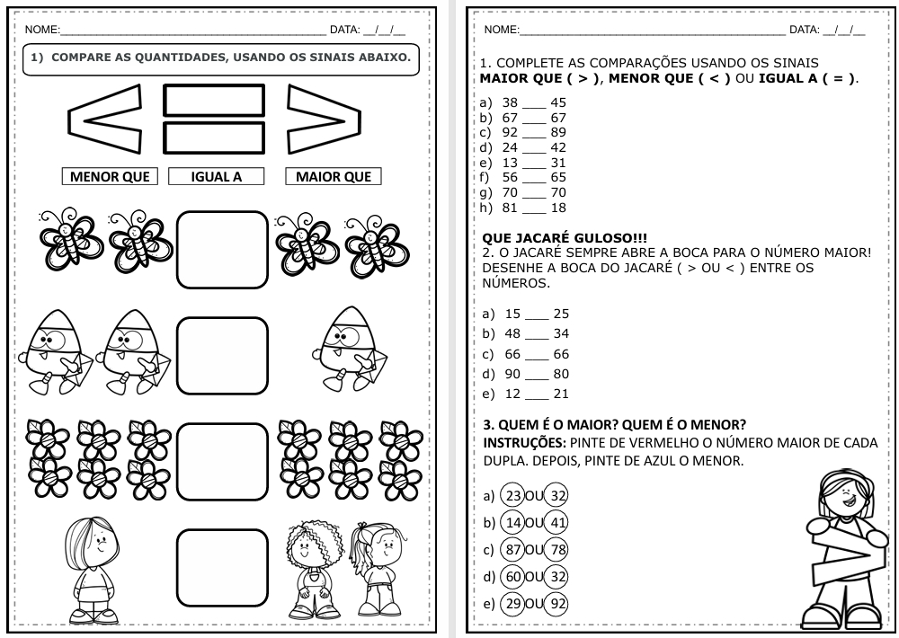 6 folhinhas com atividades de comparação de números para 1º e 2º ano