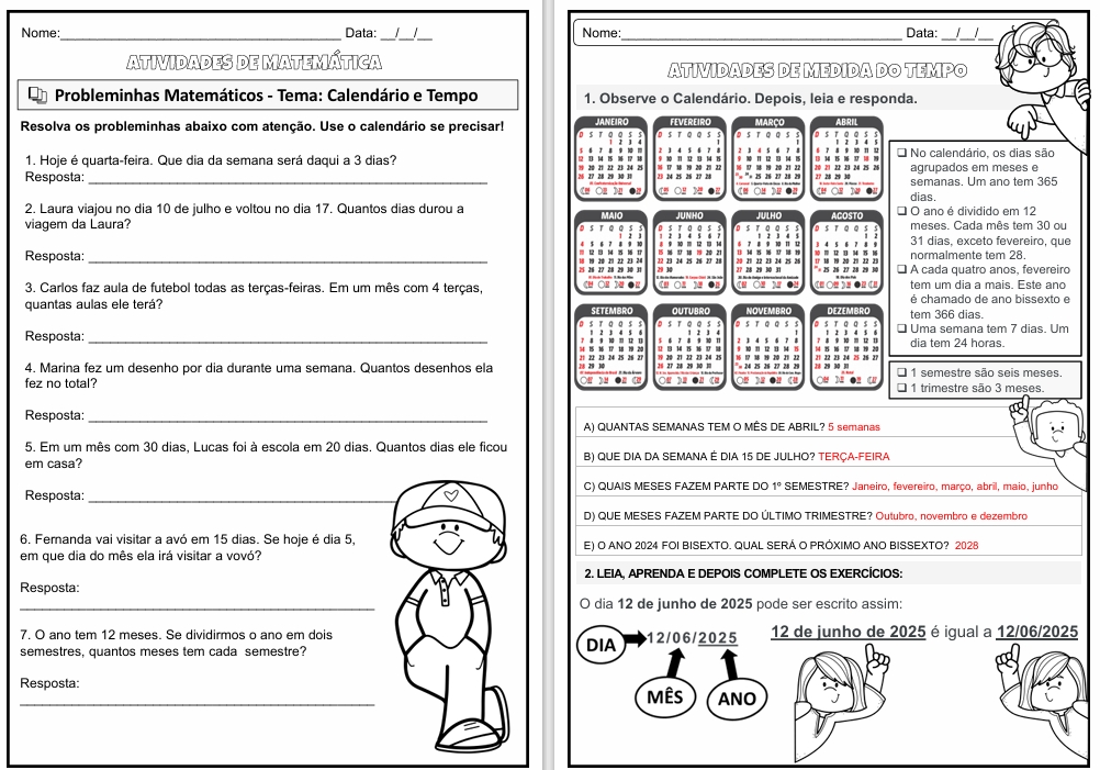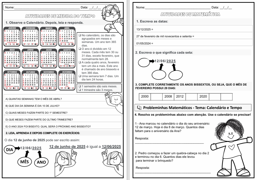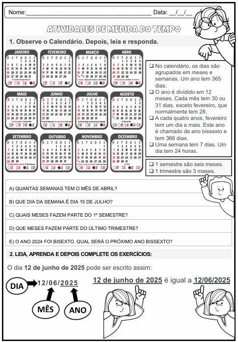 Atividades de Medida de Tempo e calendário com conceito.
