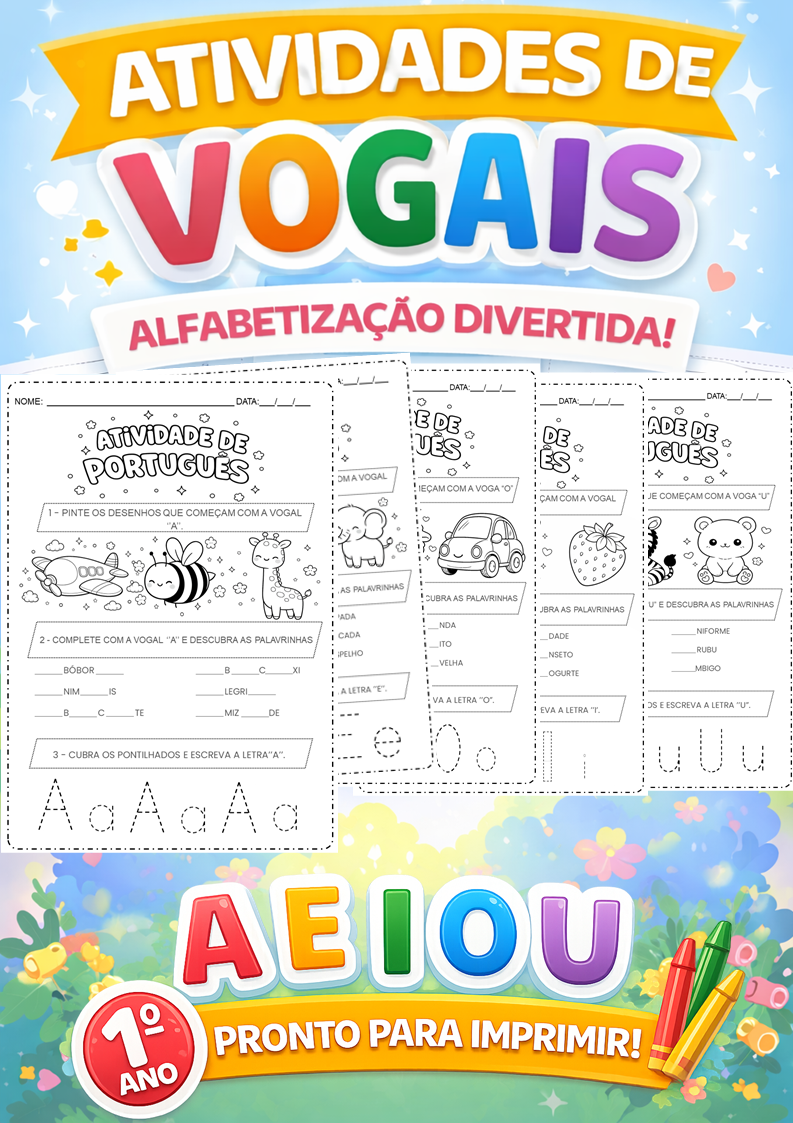 Um material completo para trabalhar todas as vogais com crianças do 1º ano do Ensino Fundamental, respeitando o ritmo de aprendizagem dos pequenos.