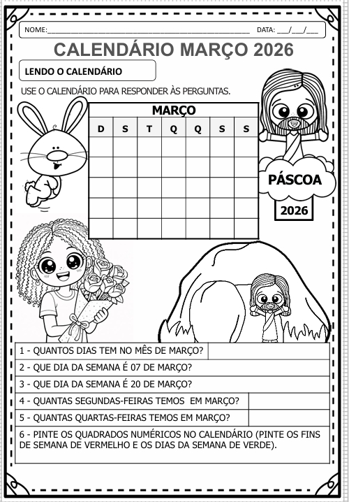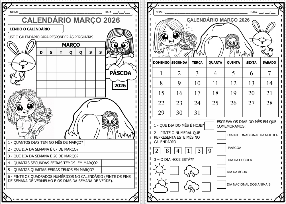 Calendário do mês de março em 2 modelos. Completos e para completar