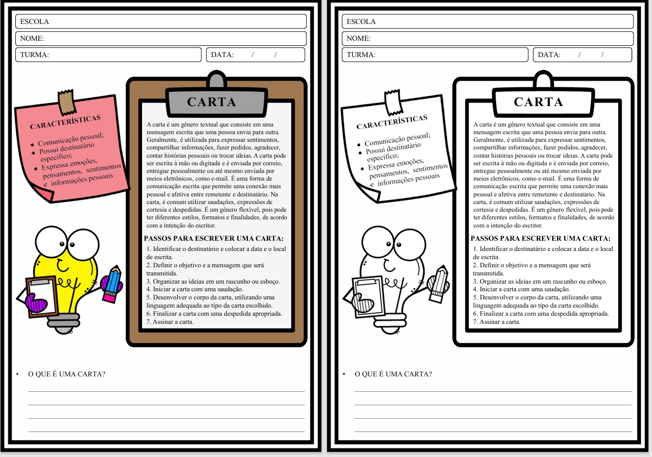 Se você quer ensinar GÊNERO TEXTUAL CARTA de um jeito claro, prático e encantador, esse material é PERFEITO! 💛