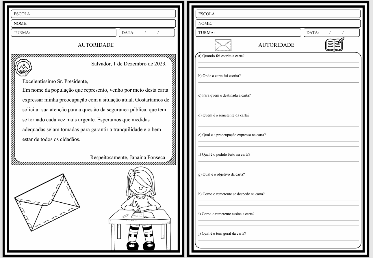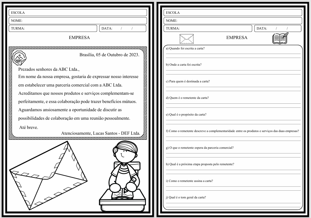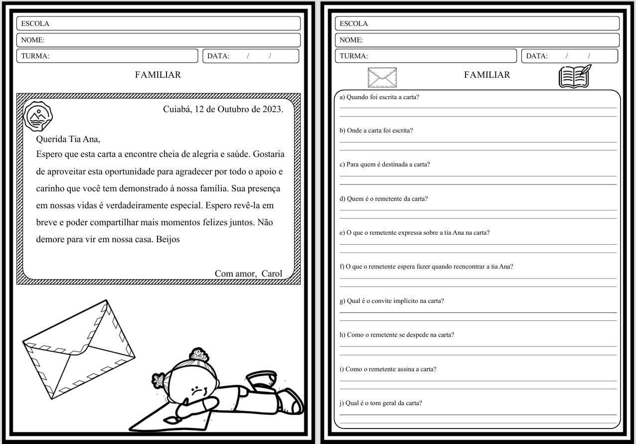 ✅ Atividades de interpretação (A–J) para cada carta (prontas para imprimir e aplicar)