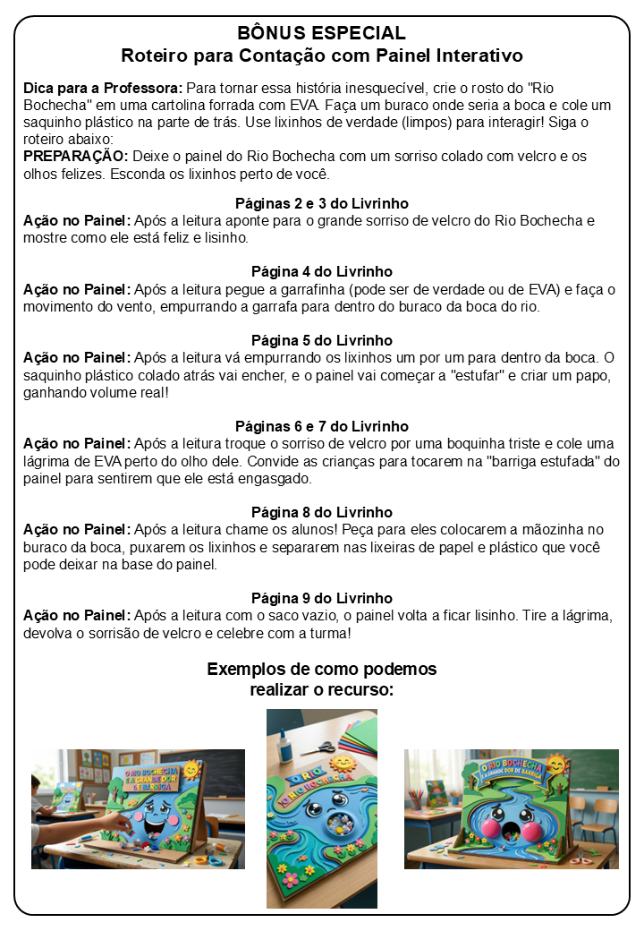 • Painel Interativo: Um roteiro detalhado para o(a) professor(a) criar um recurso visual onde as crianças podem “alimentar” o rio com lixo e depois ajudá-lo na limpeza, vendo a transformação de sua barriga em tempo real!