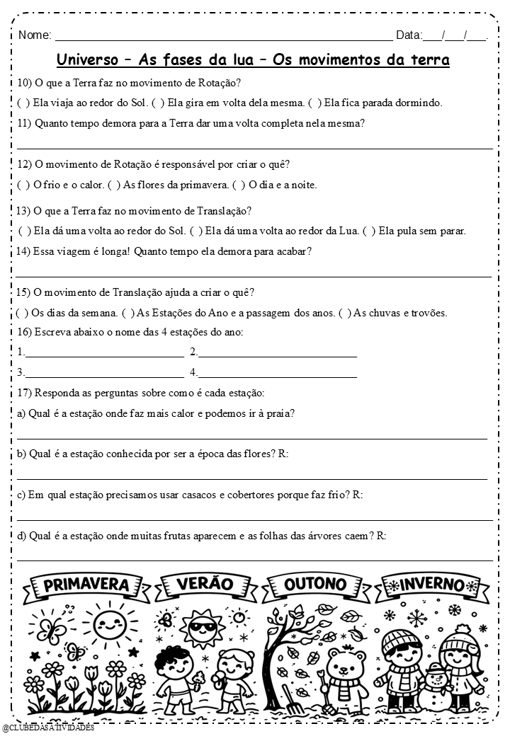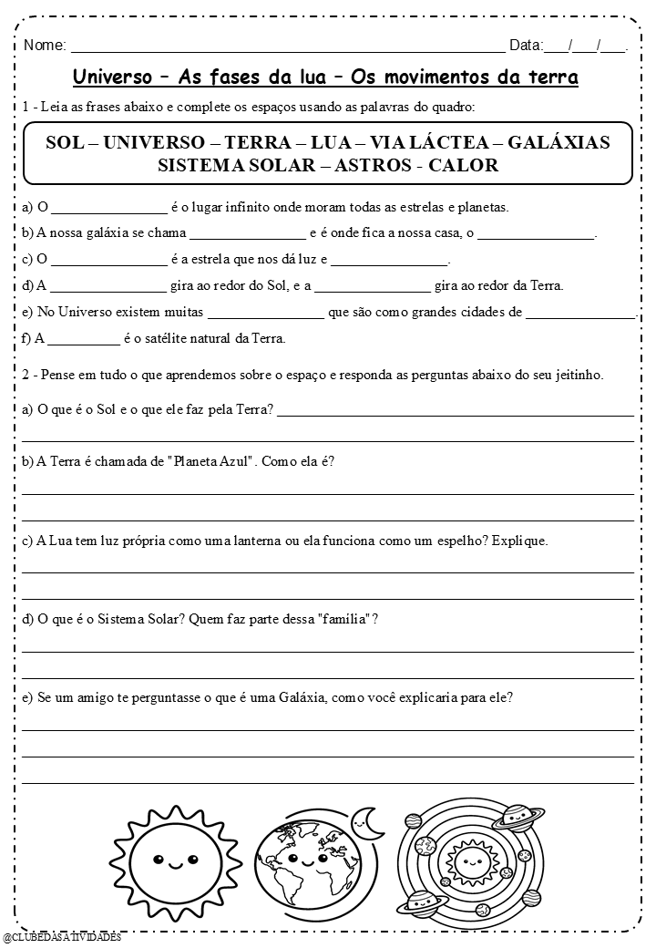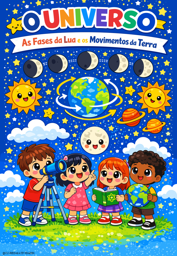 Seu aluno vai aprender de verdade sobre o Universo, as fases da Lua e os movimentos da Terra — com linguagem simples, atividades envolventes e ilustrações fofas que encantam 💫
